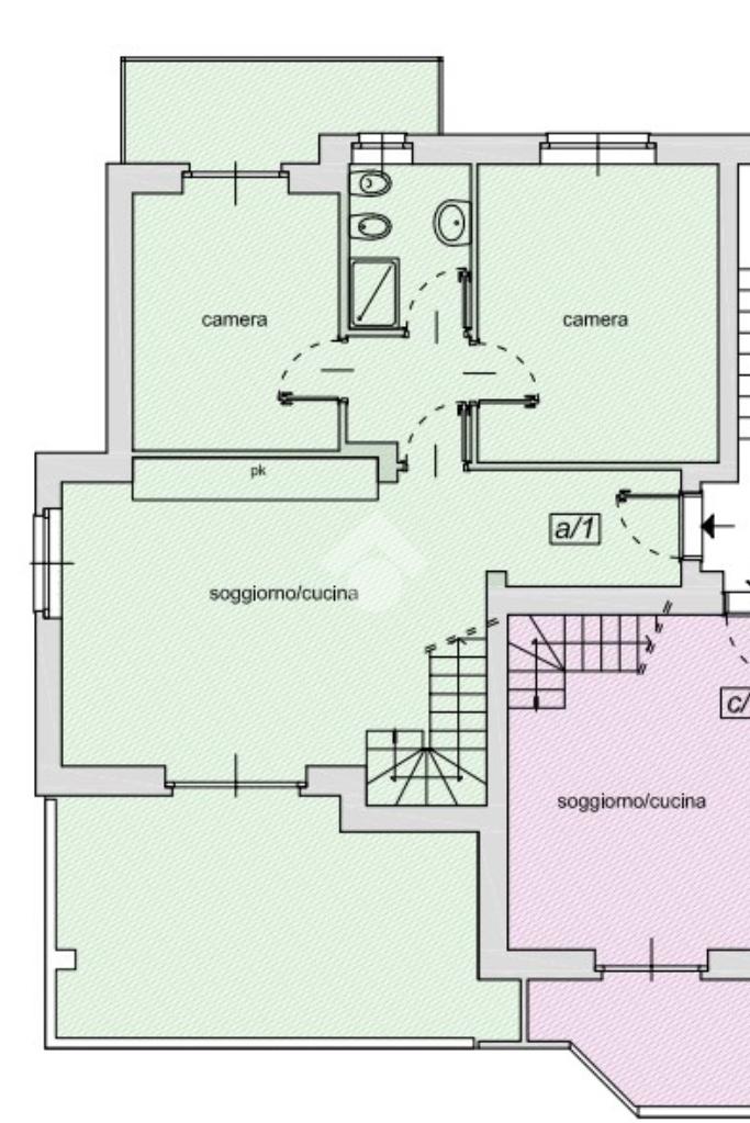 L’alloggio ha una superficie complessiva di circa 180 mq. Al primo piano si trovano la zona giorno con affaccio sulla terrazza, due camera da letto ed un bagno.